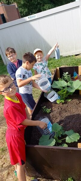 Nous avons regardé des vidéos sur la biodiversité et nous avons joué à un jeu de dominos. Ensuite, nous avons décidé de faire pousser des plantes dans les bacs. Nous avons mis du carton, puis des branches, le compost et la terre. Nous avons planté 2 potirons, un potimarron, une capucine, de la sauge, du thym et du romarin.